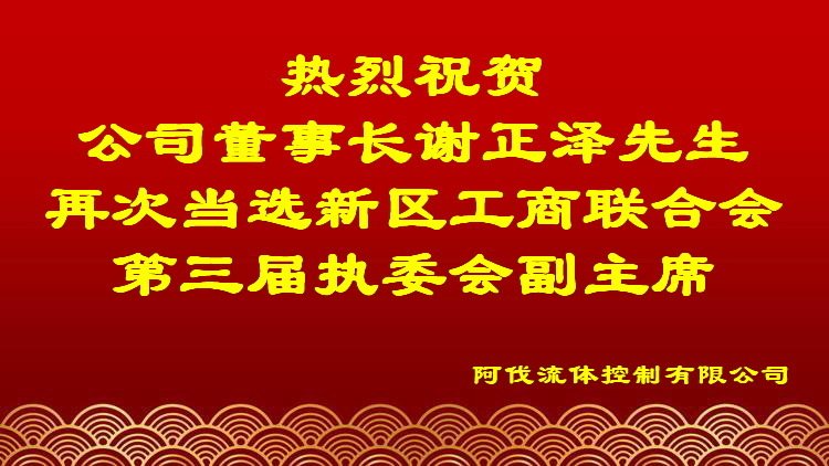 壹号娱乐流体控制有限公司董事长谢正泽先生再次当选西海岸新区工商业联合会第三届执行委员会副主席,公司全体员工向董事长谢正泽先生再次当选表示热烈的祝贺。